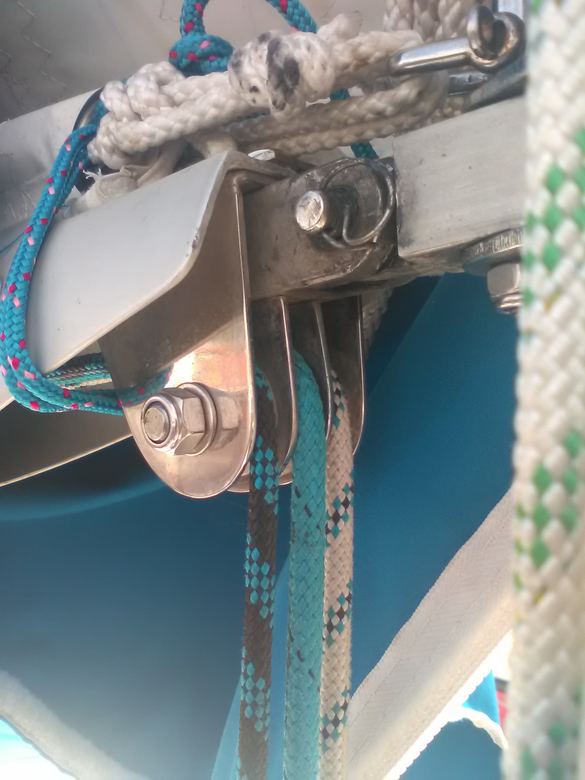 Jouw eerste foto heeft een mooi blok voor 3 lijnen. Ik kan niet goed zien waar je die bevestigd hebt, maar het lijkt op een van de ogen aan de SB zijde en jouw lijnen en klemmen zijn ook SB. En inderdaad de neerhouder in het midden. Bij mij lopen neer houder en reeflijnen nog tegen elkaar. Ik denk dat het reefblok heel kort op het dek moet zitten. Zoiets zal ik kopen en dan moet toch lukken. groet Roy