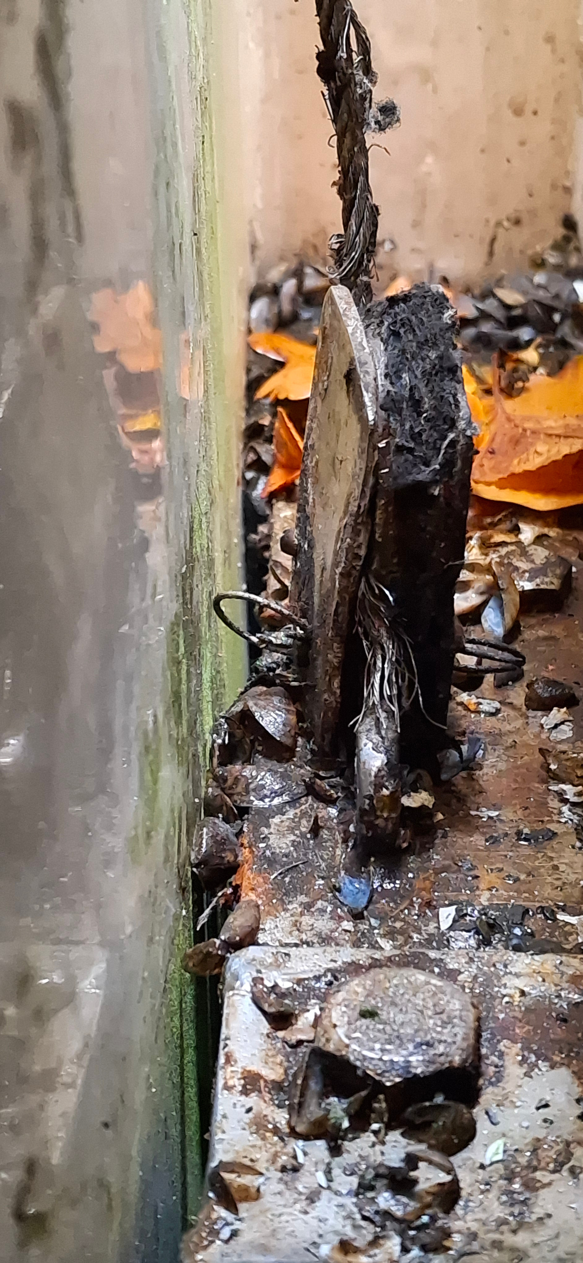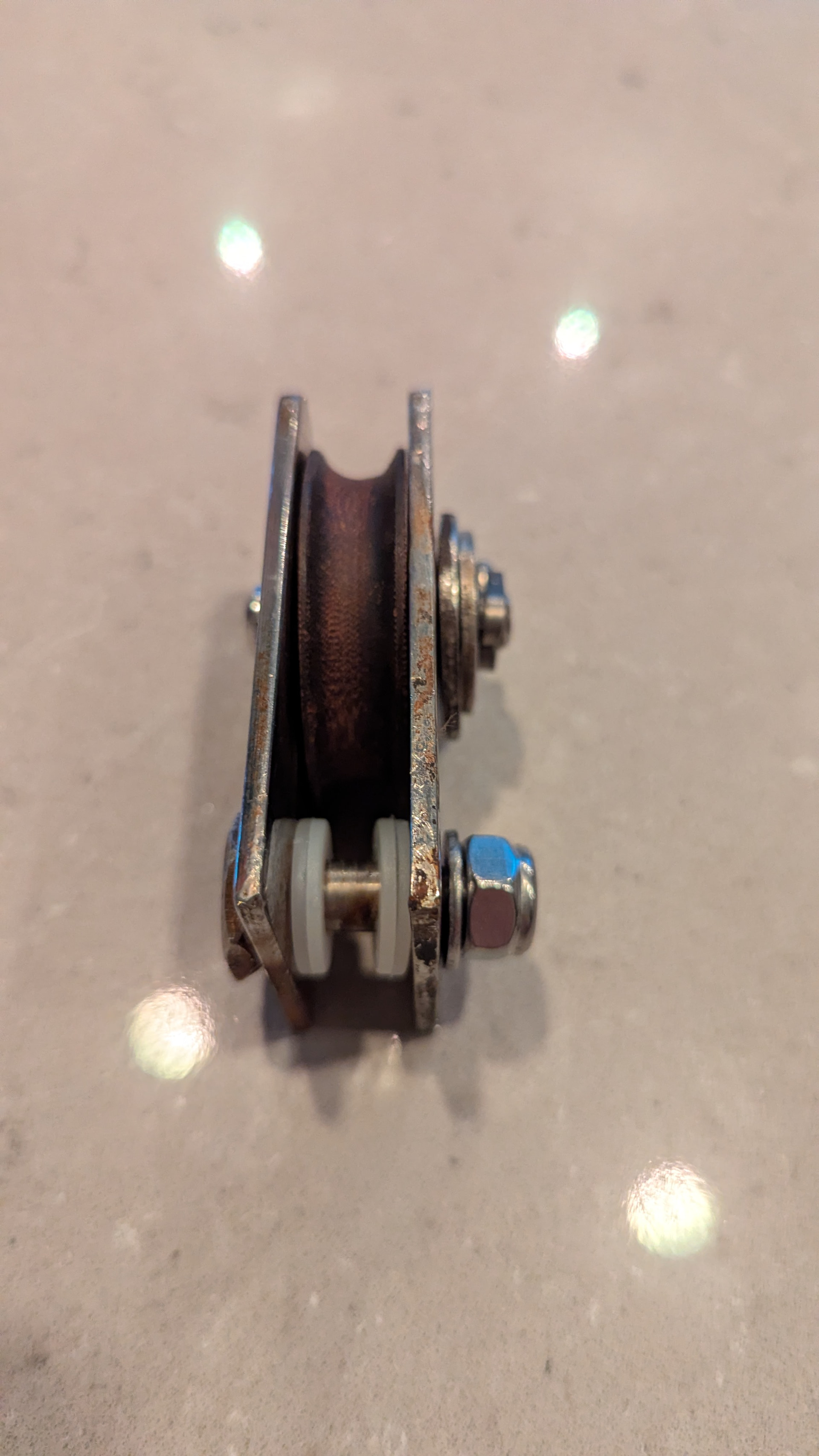 Het lijkt erop dat het wieltje aan 1 kant helemaal weggesleten is en de staalkabel nu tussen het wieltje en de wang in vastzit.