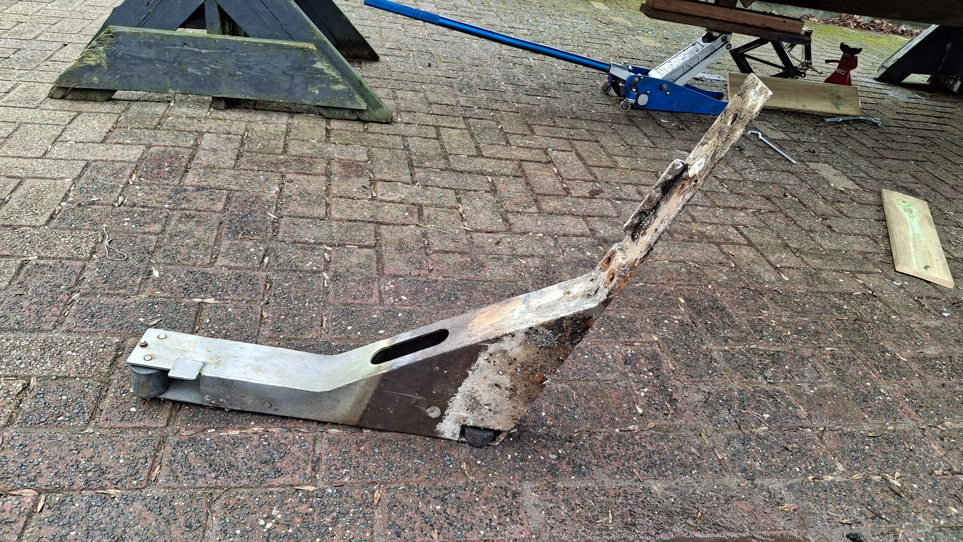 Zaterdag heb ik, samen met 2 vrienden, de kiel met een krik omhoog geduwd en uiteindelijk de RVS bovenkant van de kiel kunnen verwijderen.