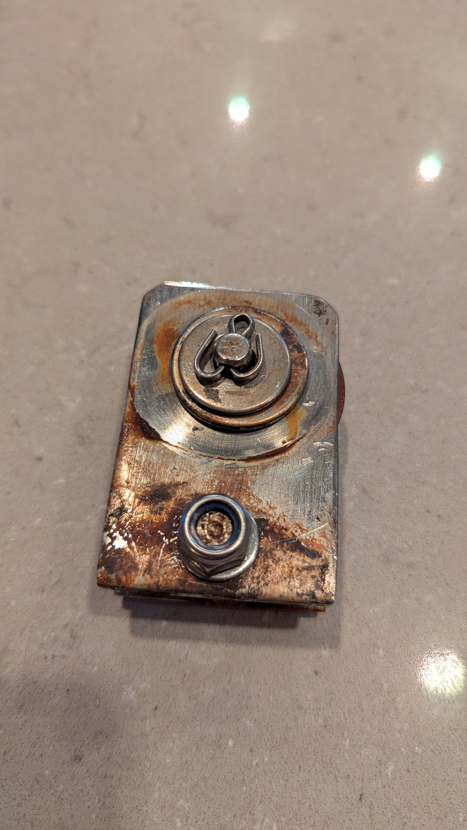 de 2 plaatjes zou ik bij nader inzien niet met bouten vastzetten maar met gladde pennen. Dan vreet de schroefdraad niet in het RVS. Ook wil je niet dat eventuele zijdelingse krachten of bewegingen op de lasnaad uitkomen. De bovenkant van de 2 plaatjes kan je wél met dunnere boutjes en afstandsbusjes vastzetten om te voorkomen dat de staaldraad tussen blok en plaatje kan schieten.