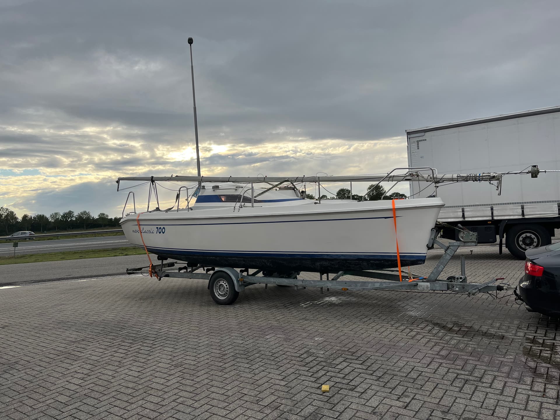 Ik heb de boot opgehaald en bij mij thuis neergezet. Hieronder een foto van onderweg.