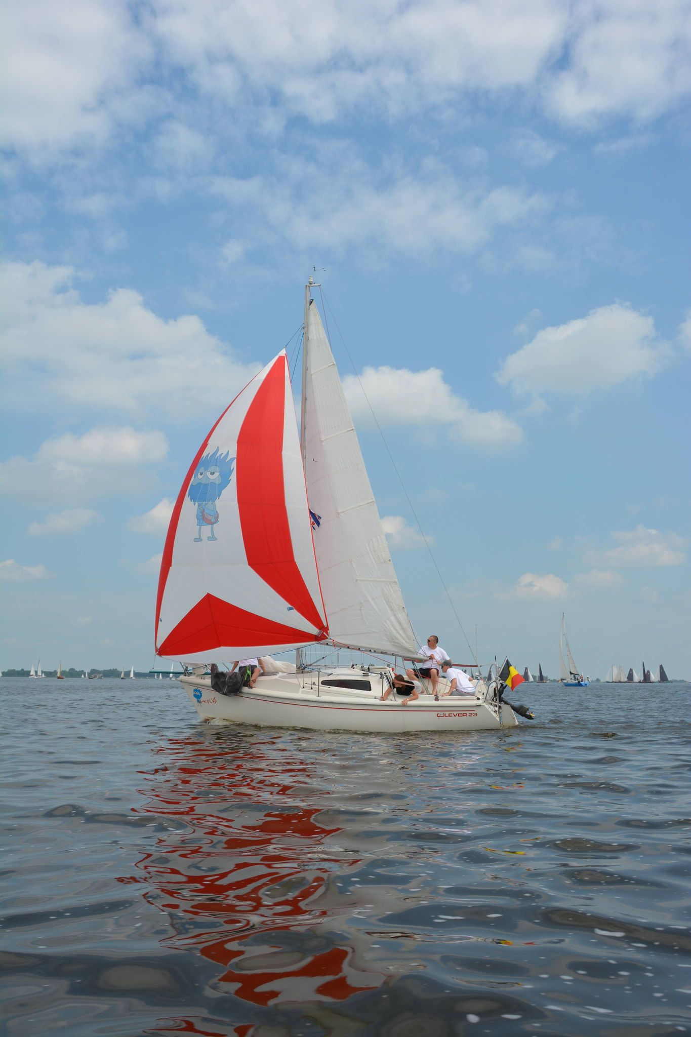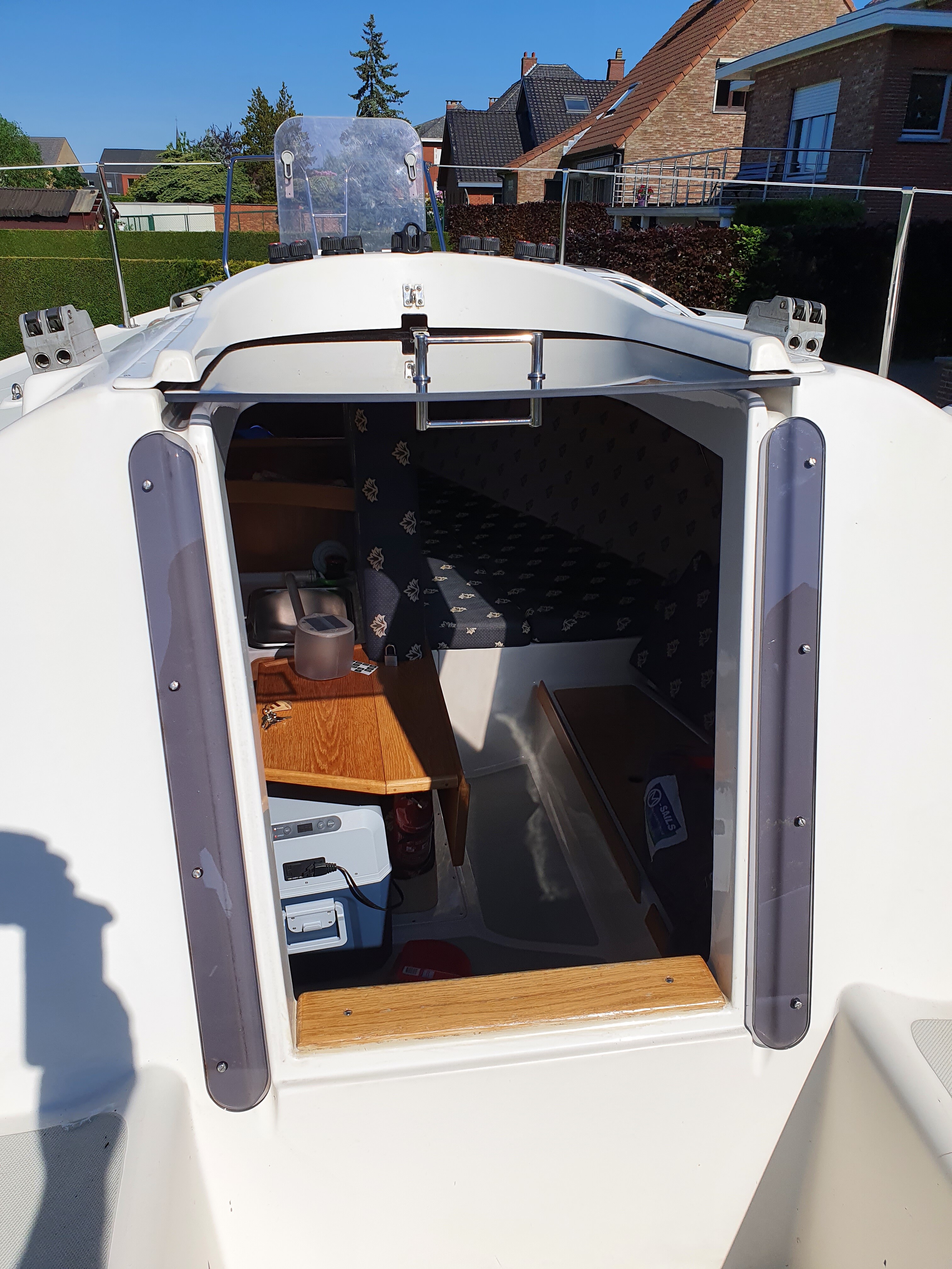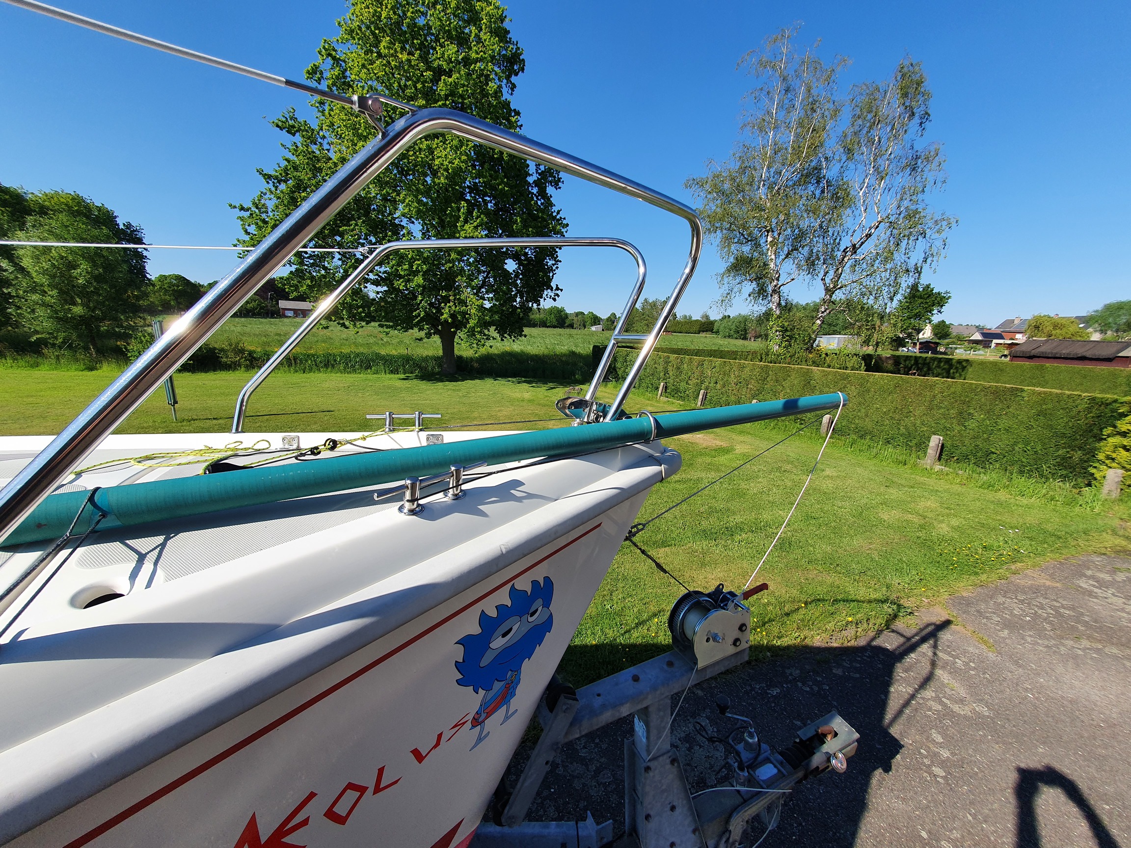-En dan het “meesterwerk”. Alles voorzien voor een gennaker, incl boegspriet en dat zonder gaten te boren in de boot. Hiervoor is alles nog niet helemaal klaar maar het is enkel nog wachten op de laatste stukjes dyneema. En dan testen maar.