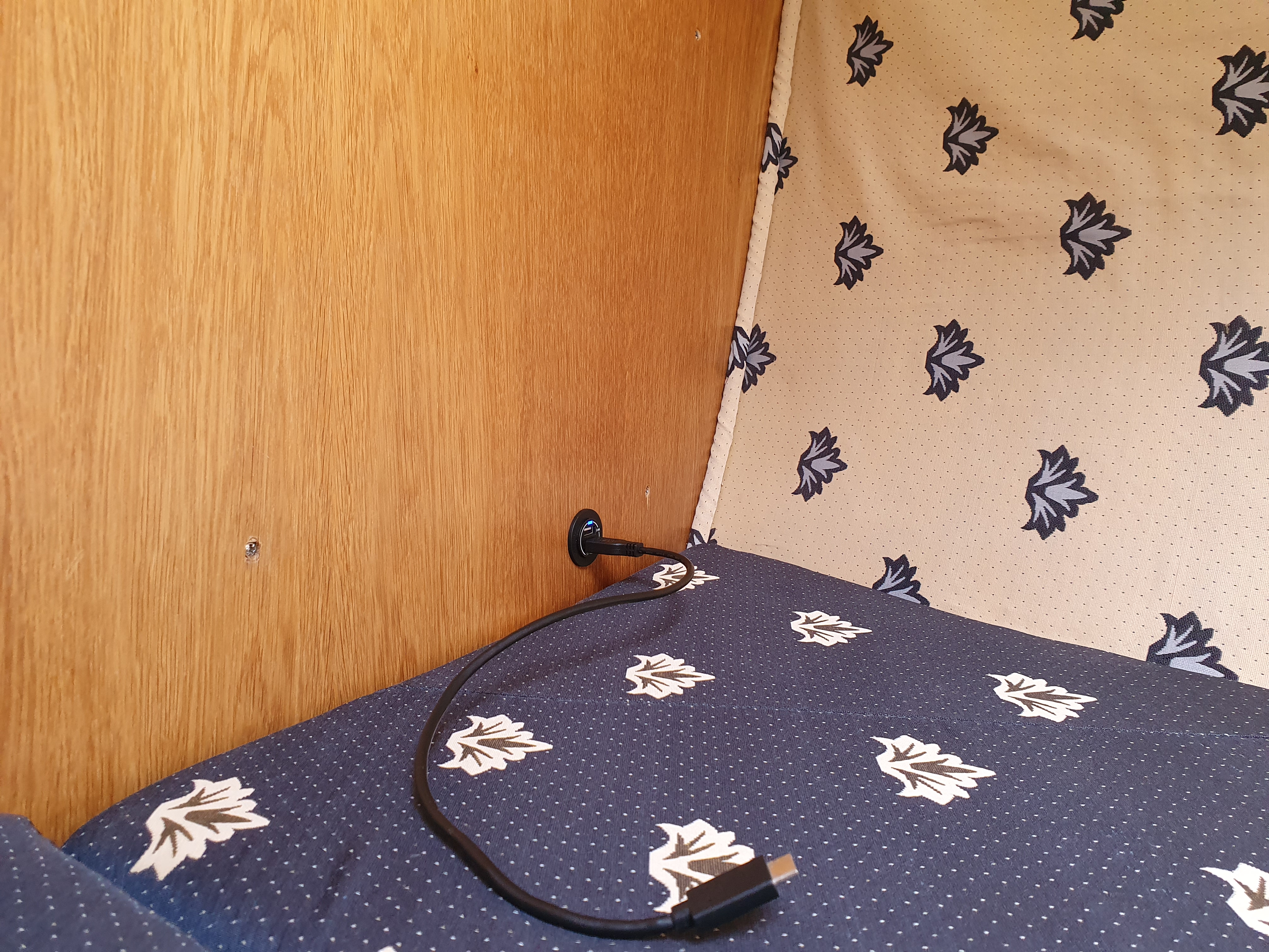 Aangezien ik maar één 12v stekker had was het inhet verleden kiezen. Koelkast of smartphone opladen. Bovendien starte de koelkast regelmatig niet. (Te hoge startstroom) Dus heb ik de 2x1,5² draad van het schakelpaneel naar de 12 stekker vervangen door 2x2,5² draad en heb ik er een USB inbouwstekker bij geplaatst.