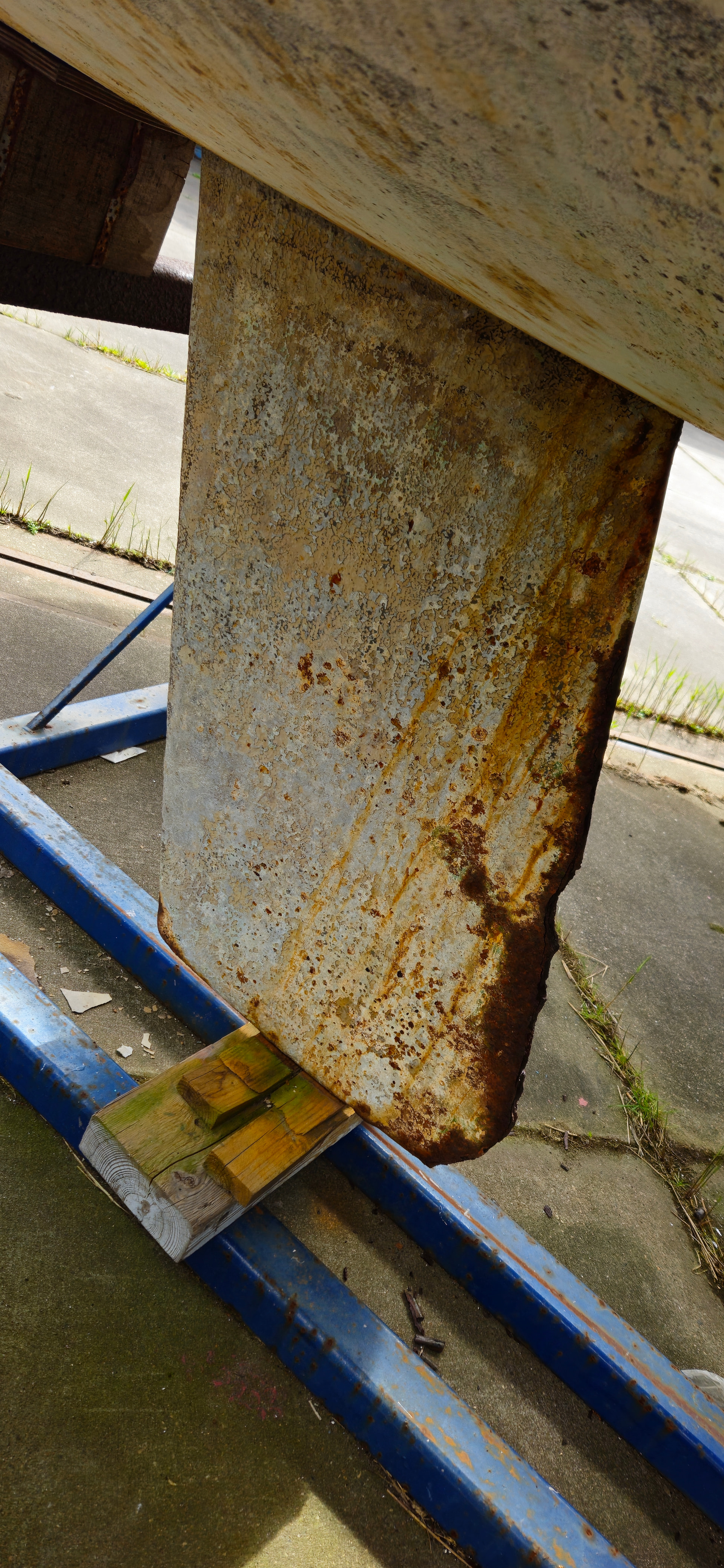 2 als de kiel er uit is moet de omhulling (roestvrij staal) opnieuw aangebracht worden, en mogelijk zal hier en daar het geroeste ijzer vervangen moeten worden.