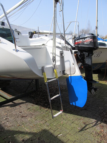 Wat me opvalt is dat je motor aan de andere kant staat. Mijn zwemtrap past aan BB in twee steuntjes en is dus volledig wegneembaar en opvouwbaar. Die zit dus ook 99% van de tijd in de bakskist. Om uit het water te kunnen moet je wel een minimum aan lenigheid hebben.